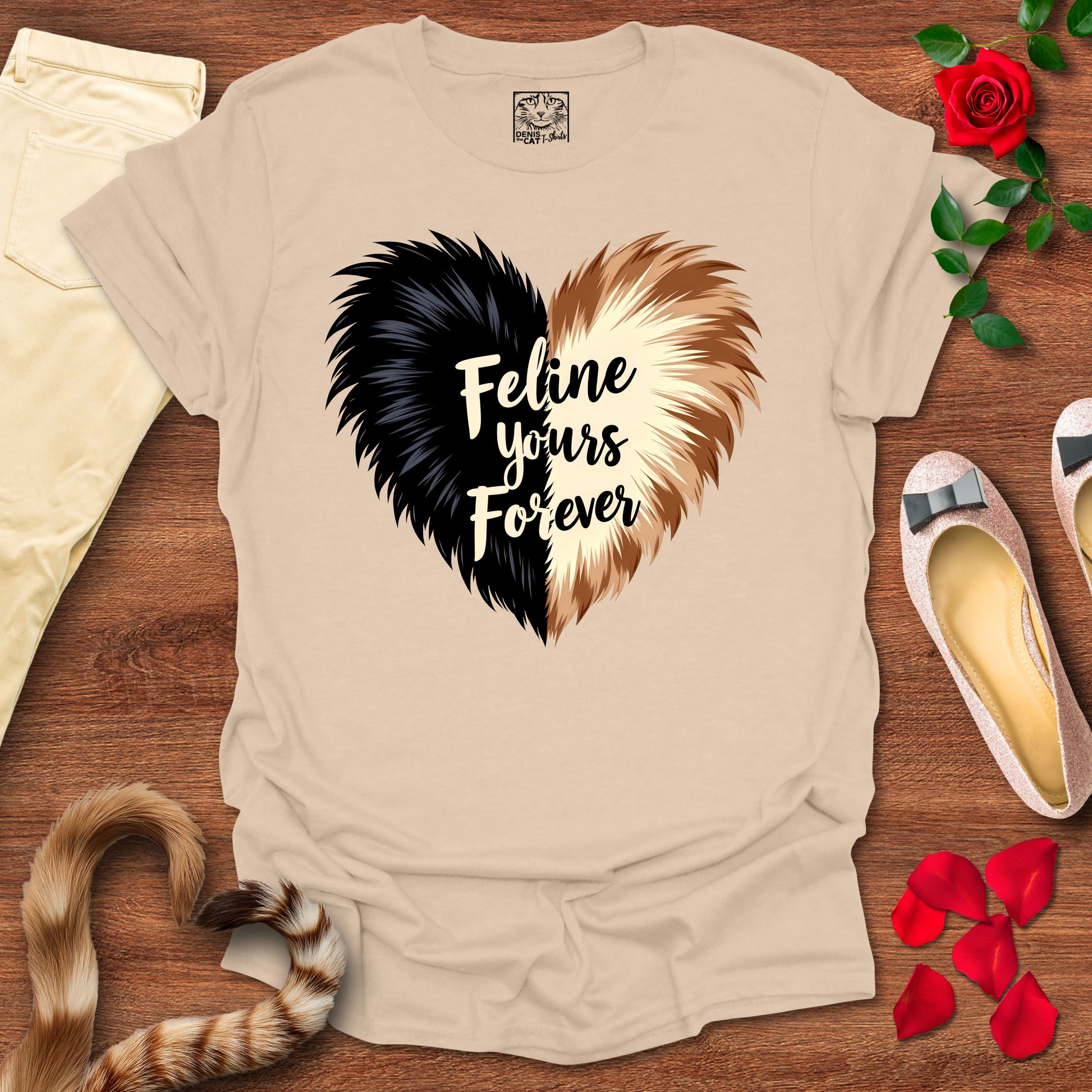 Celebrate your love for cats with this heartwarming "Feline Yours Forever" design! Featuring a beautifully textured heart made of fluffy fur in black, cream, and brown tones, this design is perfect for cat lovers who want to wear their passion proudly and is a charming addition to any wardrobe.