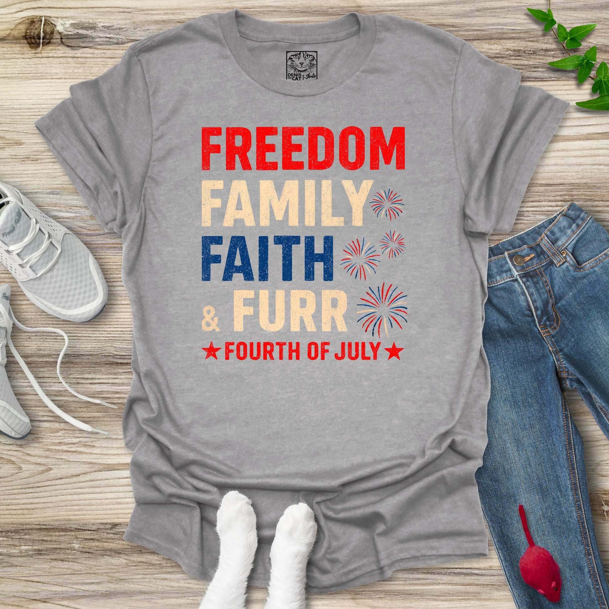 Celebrate the 4th of July with a patriotic tee that honors freedom, family, and the cats who complete it.