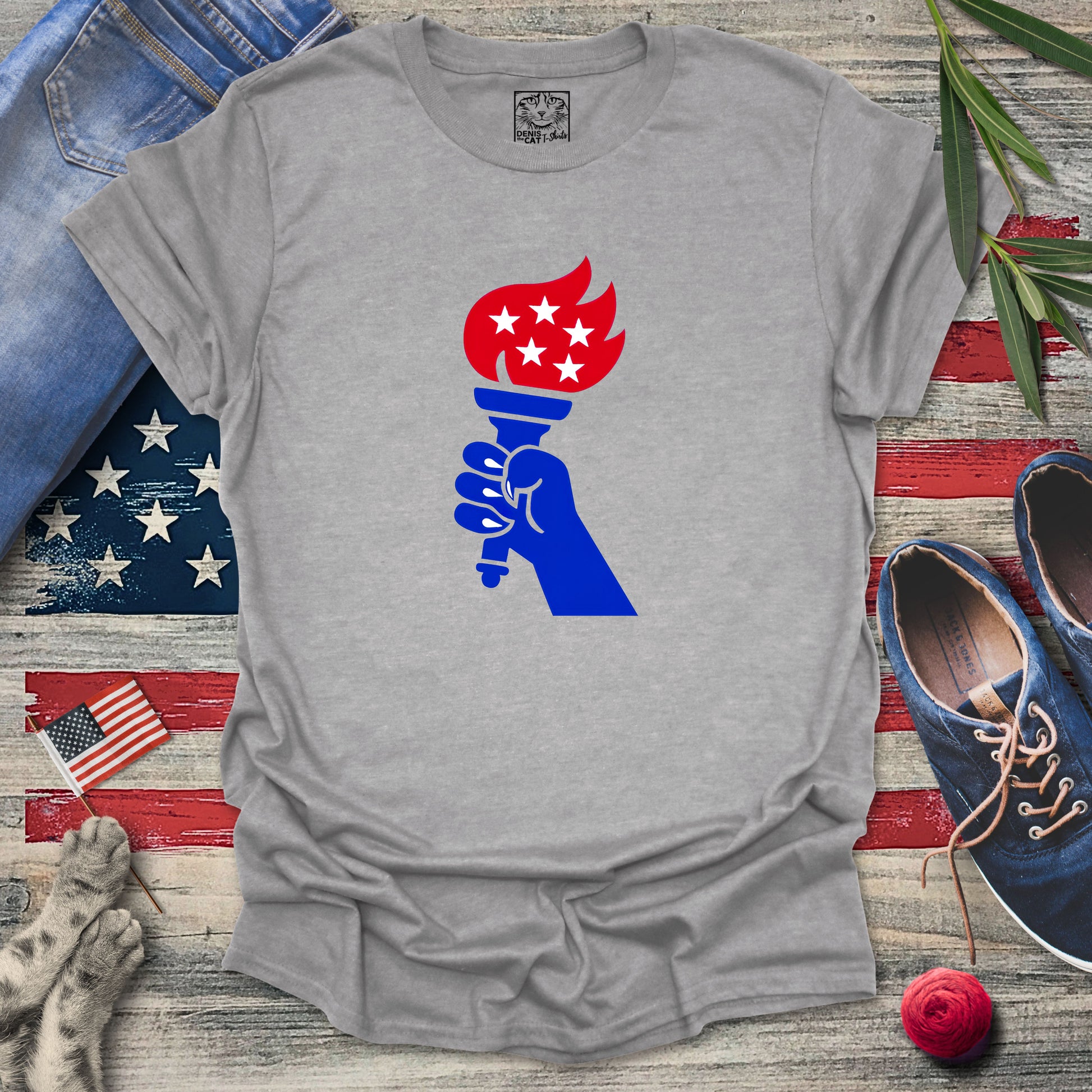 Ignite your patriotic side. Featuring a bold torch wrapped in stars and crowned with a fiery cat paw, this design is a fierce symbol of liberty—with a purrfect twist. Made for those who stand for freedom and live for feline flair.
