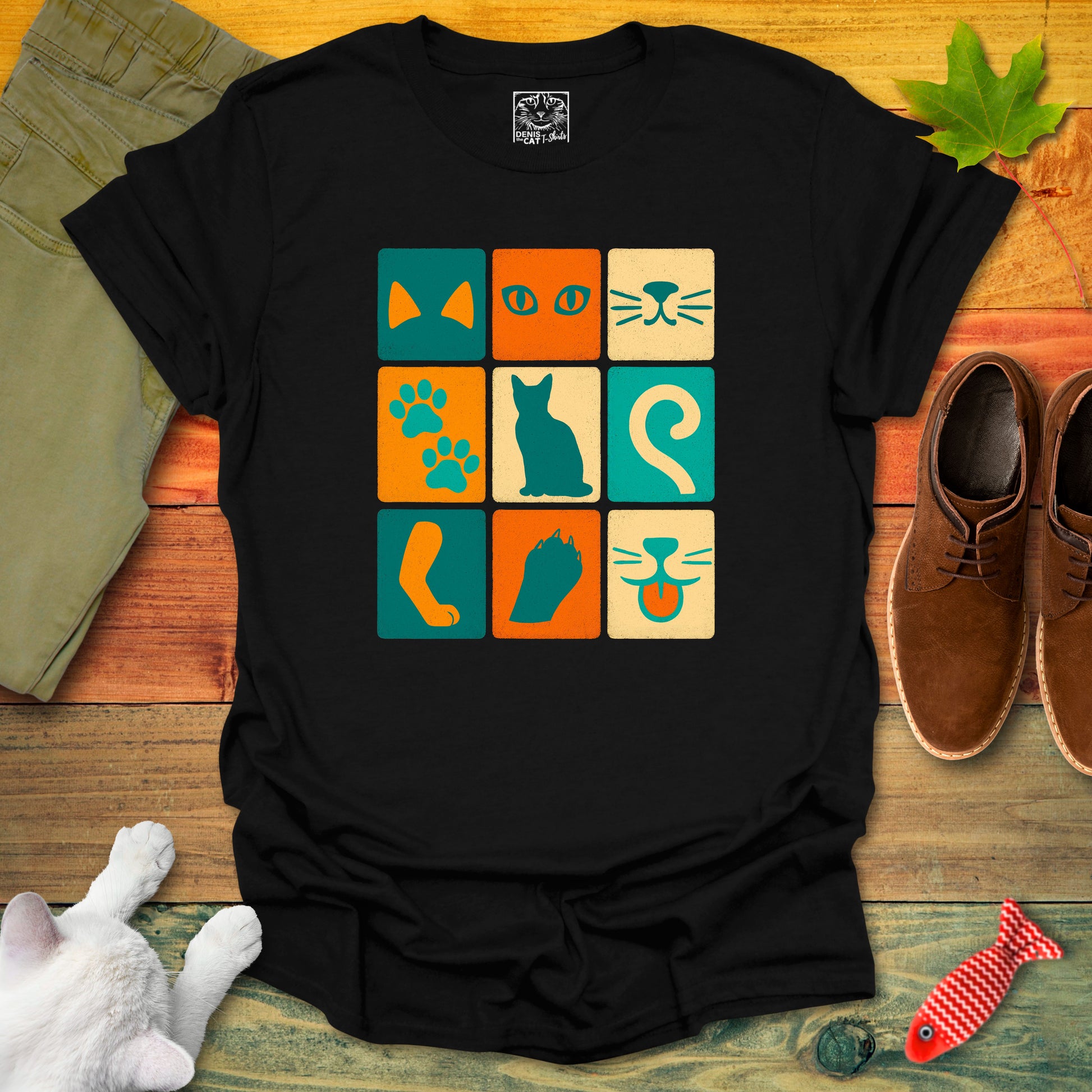 A playful grid of colorful squares featuring bold cat silhouettes and close-up details—from ears to paws to tails.