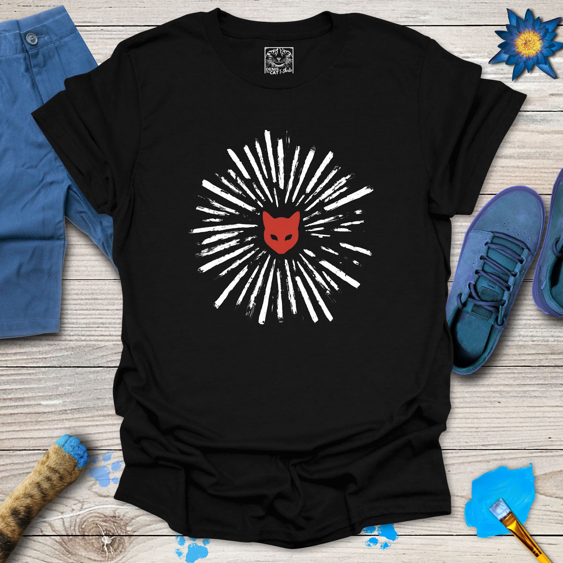 A bold red feline form stands guard at the center, its gaze unyielding and watchful. Radiating lines pierce the darkness, echoing the quiet strength and vigilance of a true guardian.