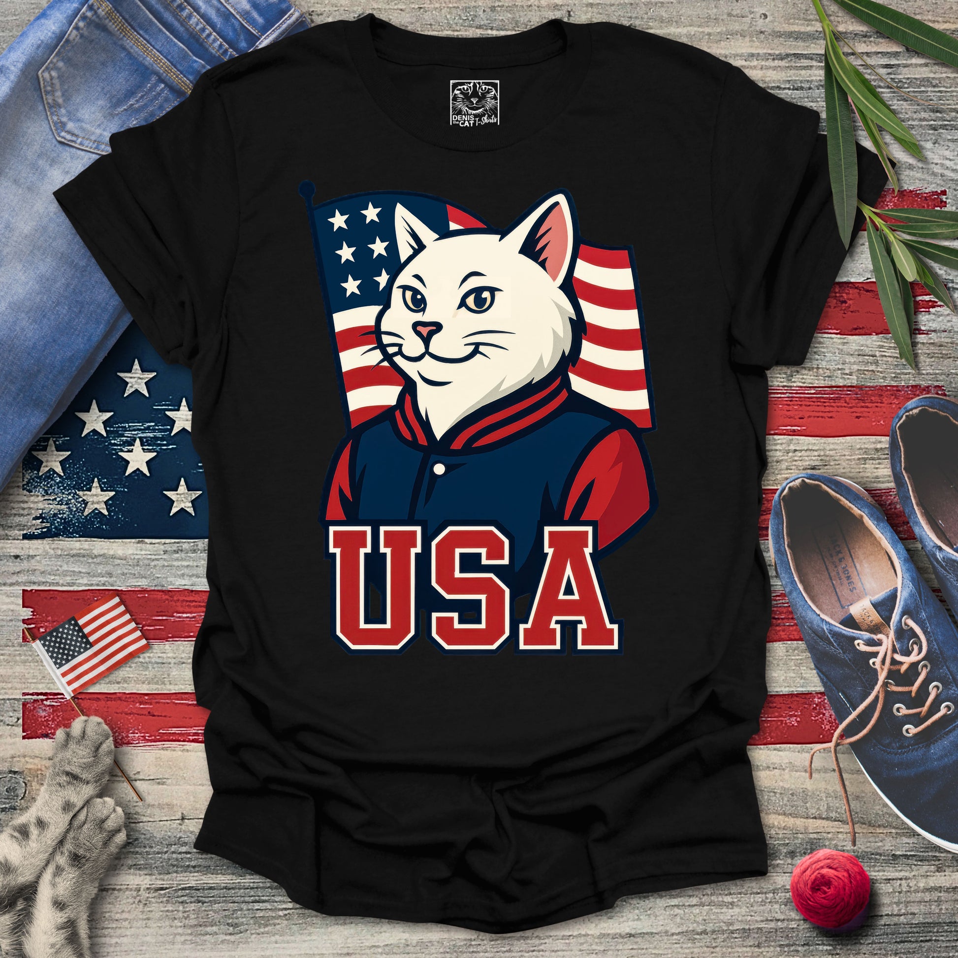 School spirit meets national pride in this bold, varsity-style USA cat tee. With a confident pose and patriotic swagger, this design is perfect for cat lovers who stand proud and purr loud. Ideal for Independence Day, parades, or everyday Ameowican flair.